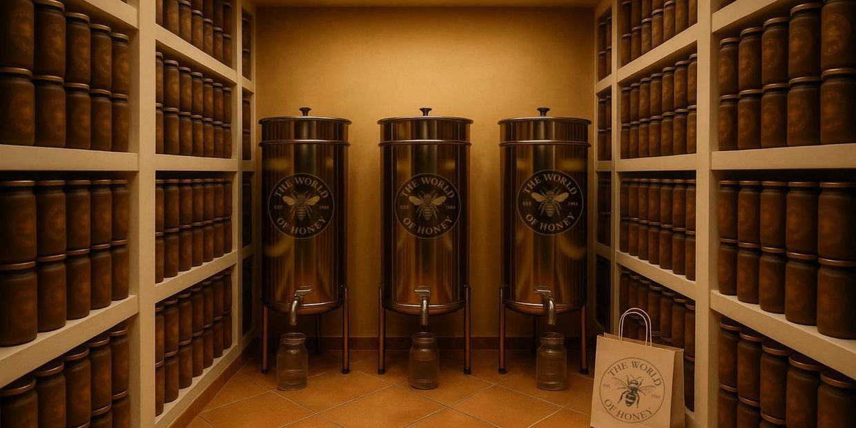 Step inside The World of Honey and discover our honey cellar, where each jar is crafted with care, filled with the golden essence of our hives, and carefully aged like fine wine to preserve its purity.